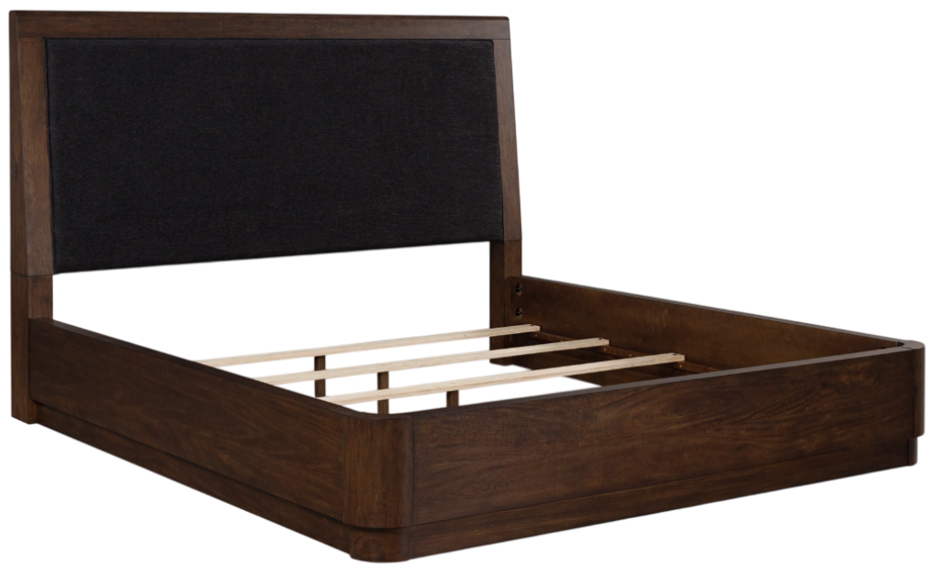 Casual contemporary styling with a decidedly modern vibe. Bathed in a rich dark brown finish, this queen upholstered panel bed is warm and inviting. Full wrap-around rails set to the floor adorn your restful retreat with on-trend elegance. A cozy upholstered headboard with layback comfort features USB charging on both sides.Read More