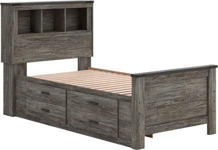 Includes bookcase headboard, panel footboard, under bed storage with side rail and roll slats
