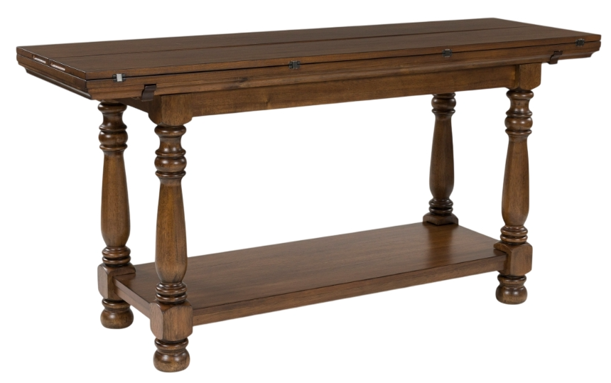 Traditional style doesn’t have to be stuffy. It can feel warm, inviting and beautifully in the moment. Case in point: this flip-top sofa table. Showcasing uniquely detailed leg posts, it has an allure all its own. Equally special is the rich brown finish, which exudes a mood of timeless charm.Read More
